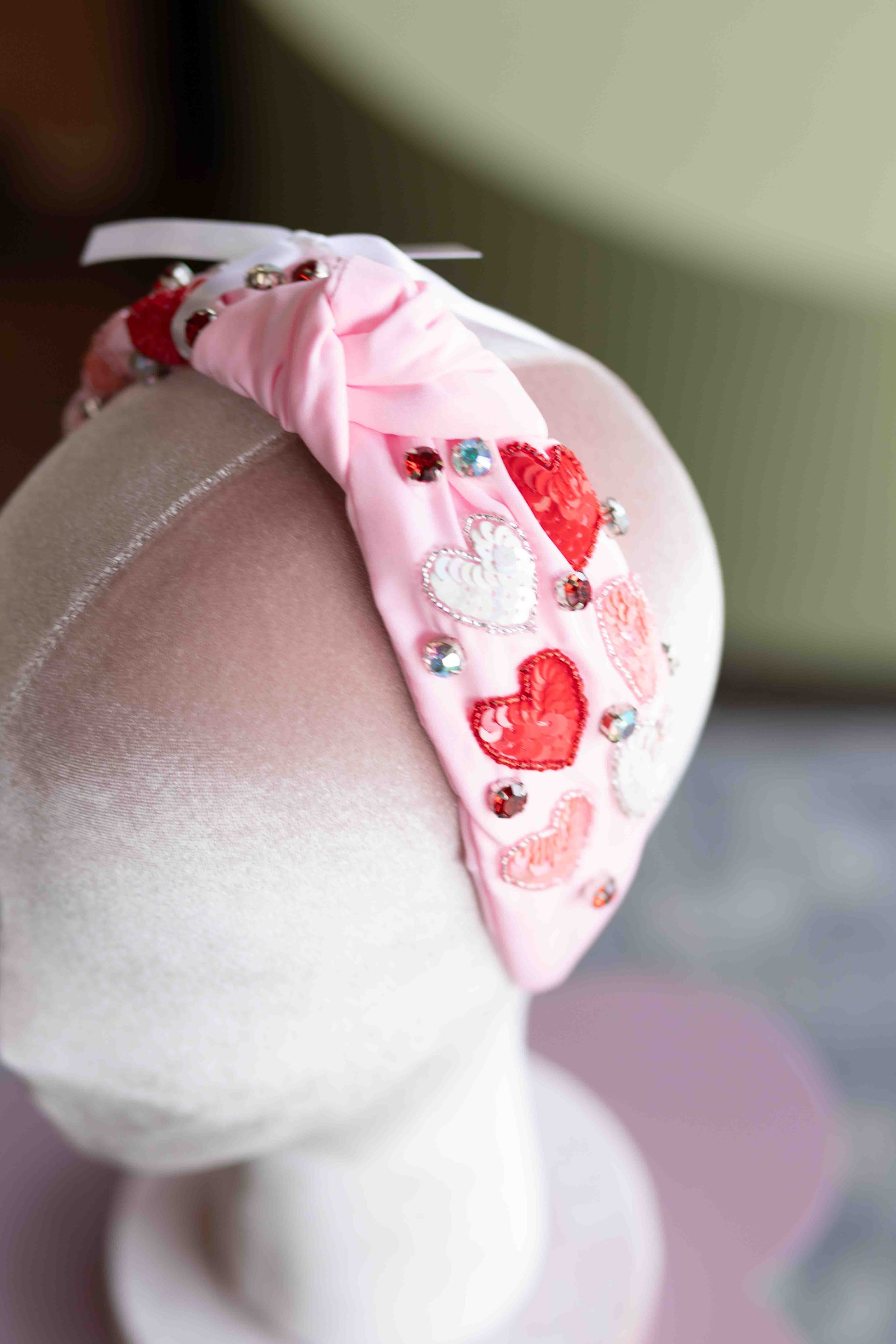 Our Love You Lots Headband is the accessory you'll pull our every February! The perfect pink paired with red, pink, + white irridecent sequin hearts + jeweled embellishments.