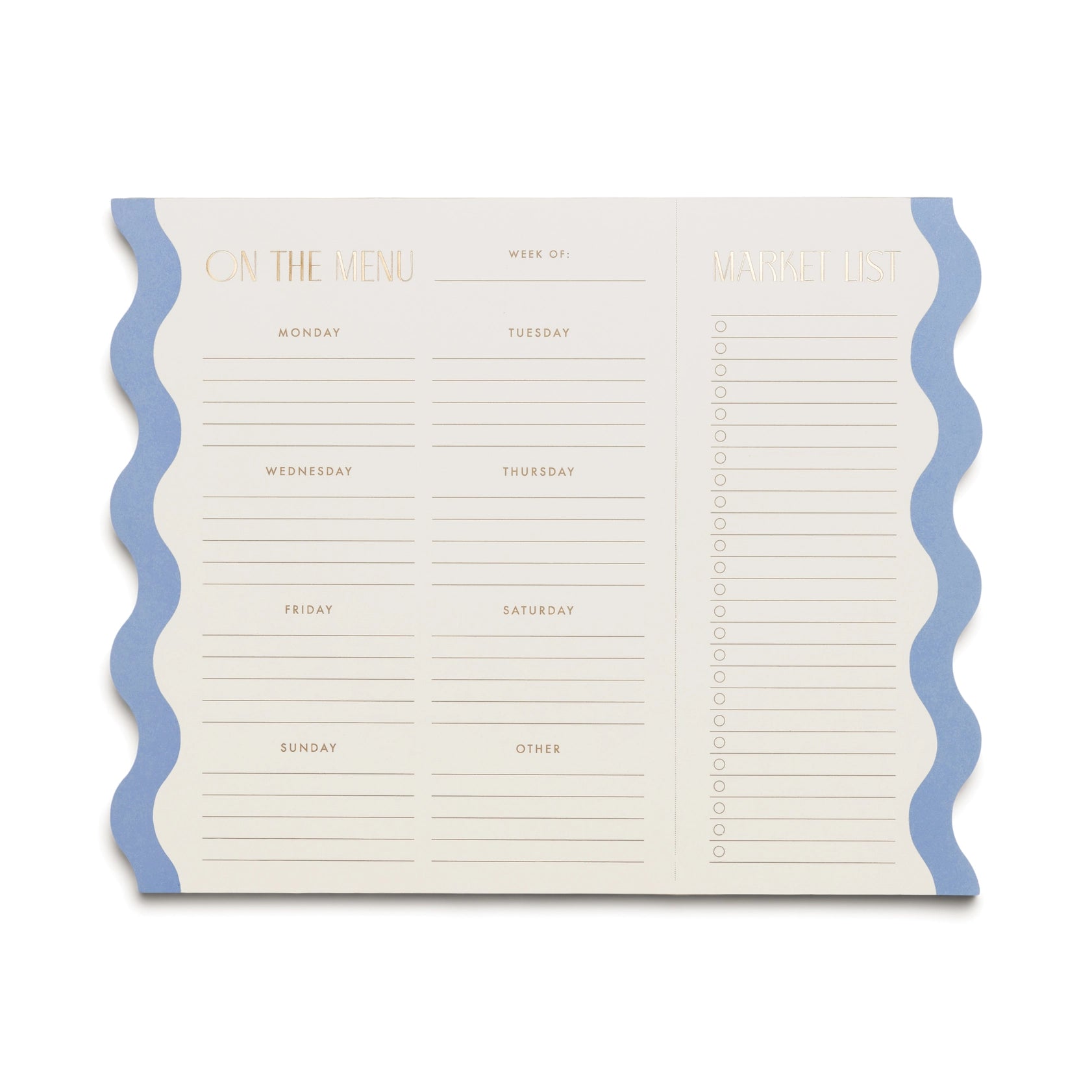 FEATURES: • 10" w x 8" h Notepad • 60 Sheets • Weekly Meal Planner Design • Double Magnets on Backer • Perforated Market List • Gold Foil Accents • Printed with Soy Based Inks on 100 GSM Uncoated Woodfree, Acid-Free Paper